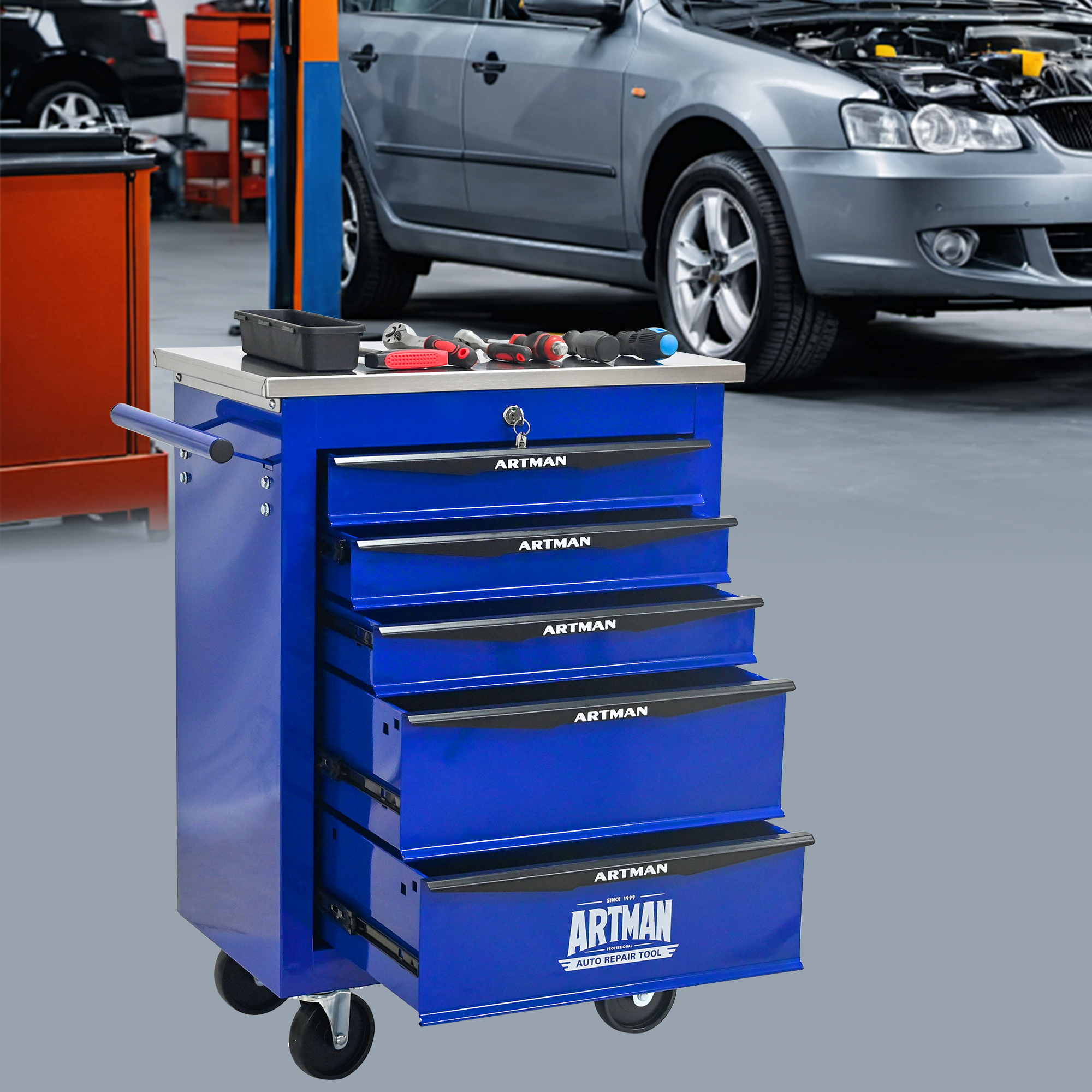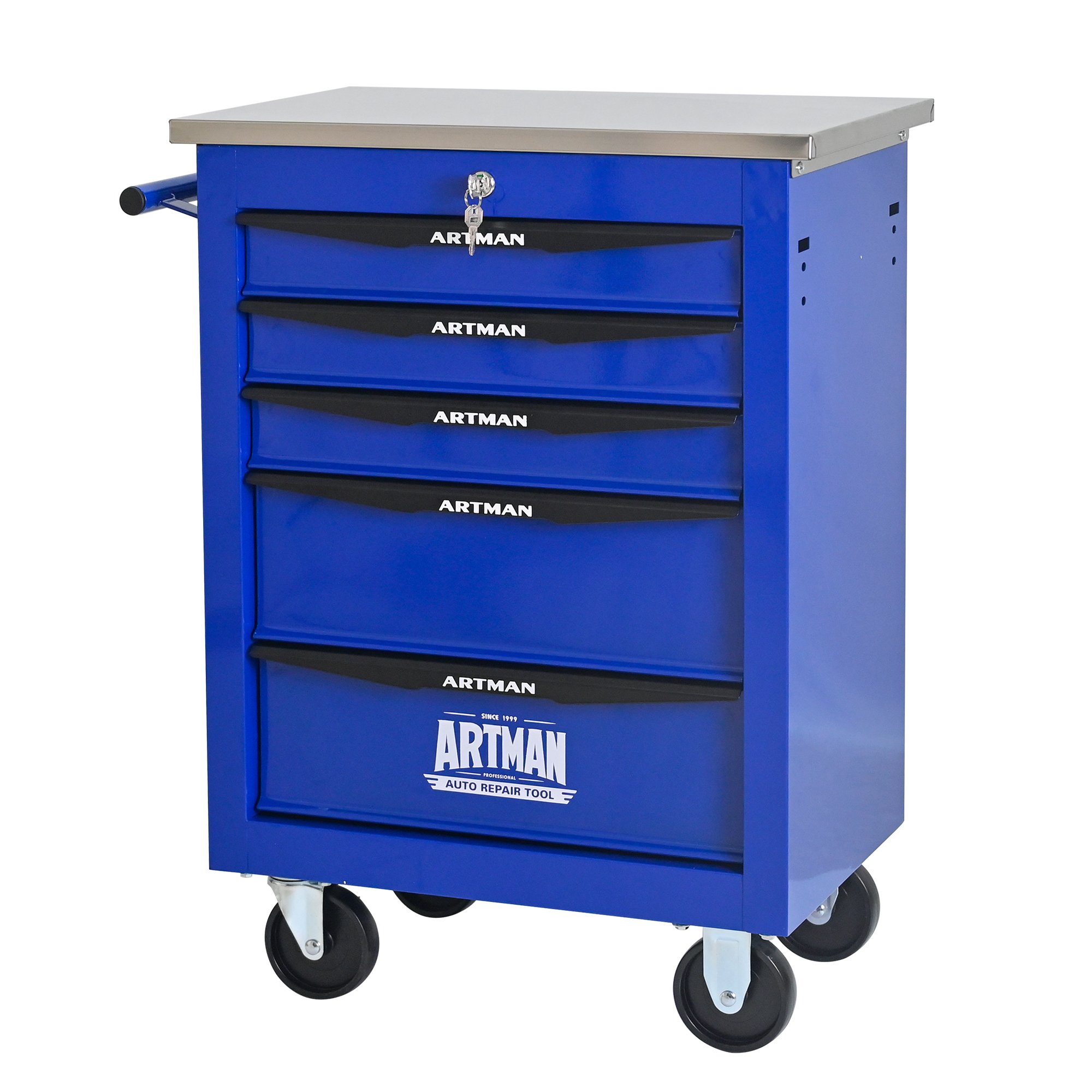 Product Name:5 Drawers Multifunctional Tool Cart with Wheels,Metal Rolling Tool Cart Storage for Garage Workshop Warehouse Repair Shop--With Stainless Steel Roof- BLACK&BLUE