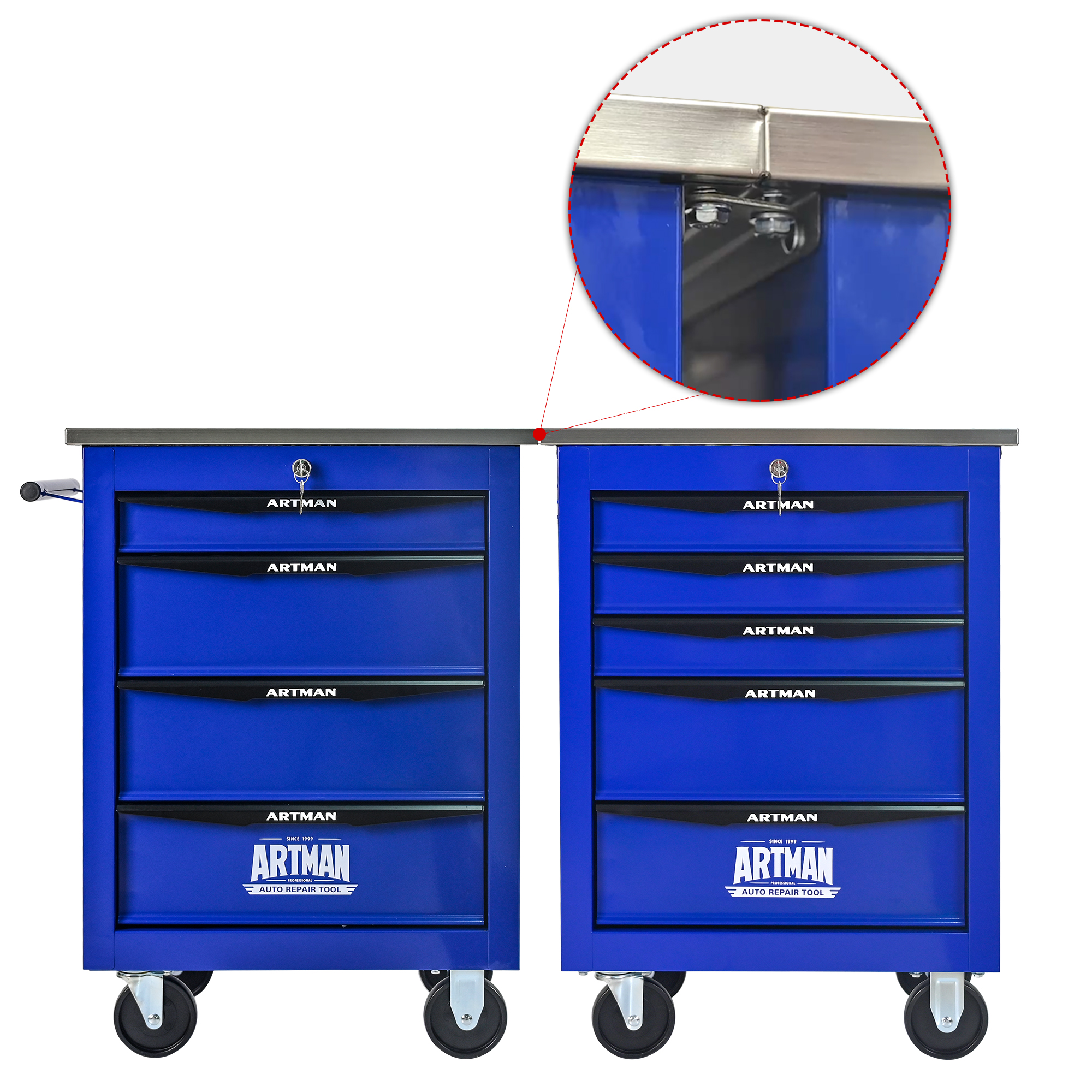 - This is a set of cabinets, can use a round hook at the bottom of the table to connect another tool car, thus forming a combination.